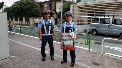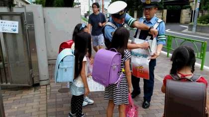 子どもたちの下校時、世田谷警察署交通安全課の方が交通安全を呼びかけてくださいました。