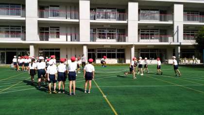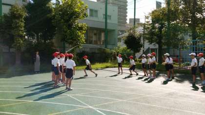 今朝の体育朝会は、3、4年生が長縄跳び運動をしました。