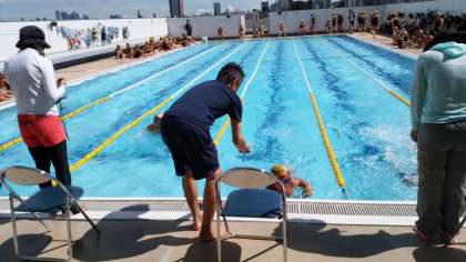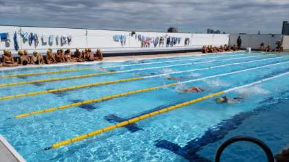 青空のもと、大勢の保護者の方の拍手とあたたかい声援を受けて、みんな一生懸命に泳いでいます。