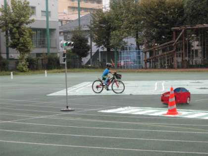 信号での待ち方やくねくね道の走行の仕方など、実際に自転車に乗って学習しました。