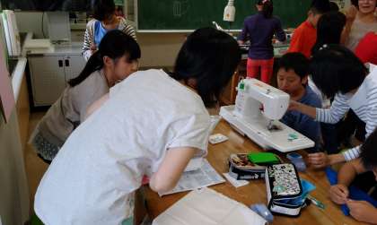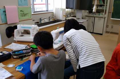 5年生は初めてのミシンです。保護者の方が何人かお手伝いに来てくださっています。あちらこちらで先生を呼ぶ声がしていて、先生も保護者の方も大忙しです。
