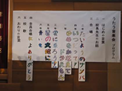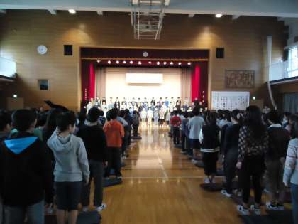 音楽朝会がありました。明日の「うたう音楽会」で全員で歌う「歌よありがとう」と「校歌」のリハーサルをしました。子どもたちの歌声が体育館に響き渡り、練習の成果が出ています。明日の音楽会をどうぞお楽しみに。