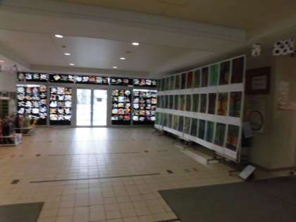 写真は、玄関の「光の色のファンタジー」(3年)「木々の対話」(4年)