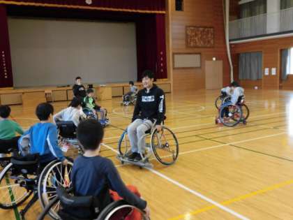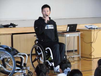 元車椅子バスケットボール選手、現在車椅子ソフトボールの選手である石井康二選手においでいただきました。前半はお話をしていただき、後半は競技用の車椅子で鬼ごっこやバスケットボールを体験させていただきました。