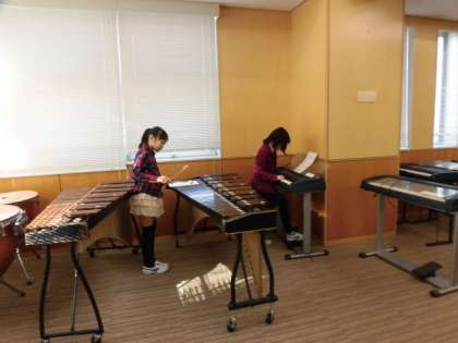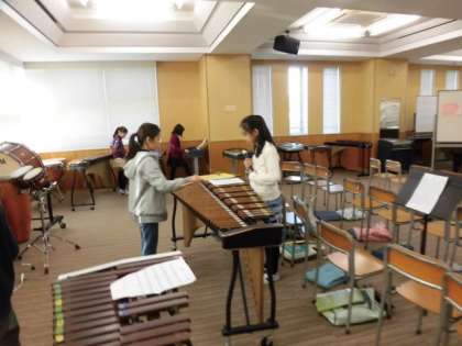 音楽の授業を覗くと、5年生が各パートに分かれて、自分の楽器の練習をしていました。