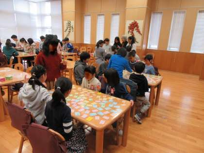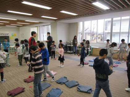 なかよし班に分かれて、全校児童で昔遊びを楽しむ「新春遊び集会」を行いました。地域の方に遊び方や、上手に行う方法を教えてもらいながら、昔遊びに親しむことができました。