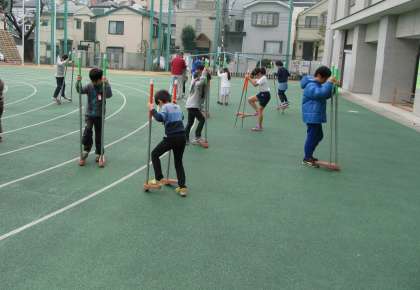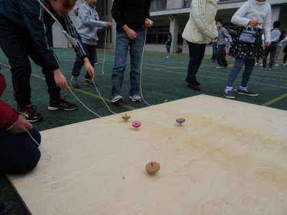 新春遊び集会の中で、けん玉、囲碁・将棋、オセロ、竹馬、コマ回し、Sけん、ゴム跳び、ぼうずめくり、カルタ、お手玉、おはじき、めんこ、だるま落とし、百人一首と、たくさんの昔遊びを楽しむことができました。