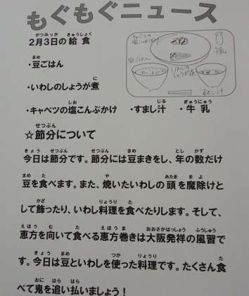 もぐもぐニュースは本校の学校栄養士が給食のある日に毎日発行し、その日の食材の紹介をしています。「いただきます。」の前に係が読んでいます。