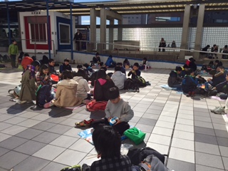 江戸東京博物館のひなたの暖かいところで昼食です。ひかげは寒いです。 (校長)