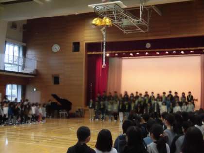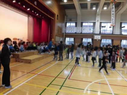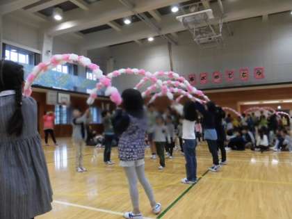 1年生から5年生が卒業する6年生をお祝いしました。4、5年生の代表委員会を中心に運営を行い、感謝の気持ちを伝えました。ゲームでは、集会委員会が王様じゃんけんを企画、運営しました。