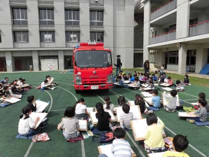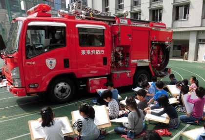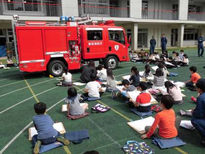 この「はたらく消防の写生会」は、本物の消防車を感じながら描くことができるため、図工の中でも大切な授業として位置づけて取り組んでいます。