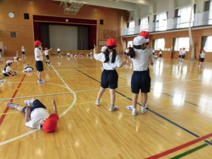 先生のリズム太鼓の合図で、カニになりきっていました。