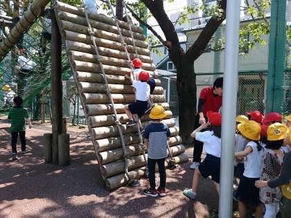 アスレチックは、先生が見守り順番に登っていました。(副校長)