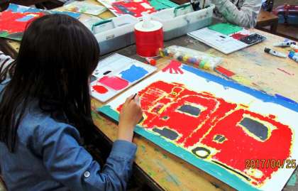 5・6校時、2年生の消防写生会の続きの授業を図工室で行いました。この日も絵の具を使いました。約束は、必ず絵の具を混ぜることです。絵の具を混ぜることで自分の色になります。自分だけの色で描き続けた絵は、自分らしい表現につながります。本物を前に描いた消防車はどれもみな生き生きしています。消防写生会の時に感じた気持ちを色でも表現できるといいなと思っています。絵の具を混ぜるということ。小さなことですが、自分らしい表現の基本です。(図工専科)