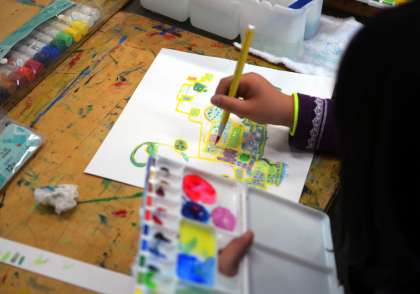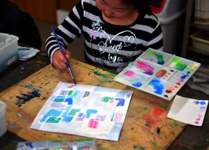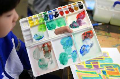 3年生、絵の具の基本的な使い方を身につけるための授業。2年生の時は、色を混ぜる楽しさを思う存分味わってほしかったので、パレットの小部屋は使わずに広い部屋に直接絵の具を出して混ぜていました。授業のはじめ「3年生では、パレットの小部屋にすべての色の絵の具を出します」と伝えると、子どもたちから「全部だすの?もったいなーい」という声が予想通り返ってきました。「この色を使おう」と頭で考えてから絵の具を出すのではなく、いつか手に持ったパレットと筆が身体の一部のようになり、感覚的に、無意識に自分の色をつくれるようになってほしいなと思っています。(図工専科)