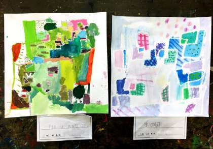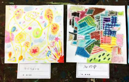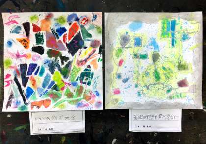 自分らしい題を付けるための工夫、そのためにいくつかの条件を設けました。それは、「どんな作品にも当てはまりそうな言葉は使わないこと」です。例えば、カラフルという言葉。今回の題材はパレットの小部屋を上手に使って混色することが目的でしたから、みんなたくさんの色をつくりました。当然、どの作品もカラフルです。ただ、カラフルといっても一人一人すべて違います。そこで「自分の使ったカラフルな色から連想する別の言葉を探してみよう」と投げかけました。決してカラフルという言葉が悪いわけではありません。でも、だれでも思いつきそうなカラフルという言葉で片付けてしまうと、一人一人の子どものもっている経験や感性が眠ったままになってしまうように思うのです。「喉元にある言葉ではなく、お腹の底から自分の持っている言葉をひきずり出す」少し荒々しい言い方ですが、名付け親になるということは、そういう作業ではないかと思っています。決して、難しい言葉、美しい言葉でなくても、今に至るまで一人一人異なる感じ方、経験をしてきた子どもたちは、それぞれに腑に落ちる自分の言葉を持っているはずです。