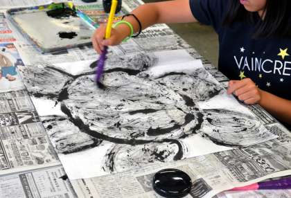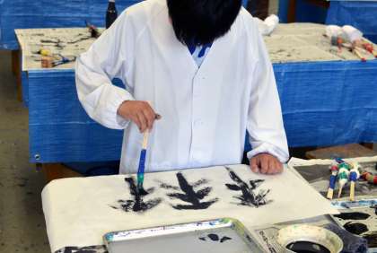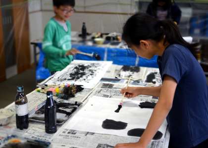 先週の6年生、「墨のうた」の授業。前回つくった「オリジナルの筆」と「消しゴム篆刻」を用いて、墨による表現に挑戦。画仙紙という滲みやかすれを表現しやすい紙を用意しました。描くテーマは特に決めていません。はじめから頭でイメージを思い描いてから表現に臨むのではなく、さまざまな材料を組み合わせてつくったオリジナルの筆が生み出す形や線、墨の濃淡、滲みやかすれなどから想像を膨らませてながら描いてみようと提案しました。こういう活動は、気持ちの赴くまま、身体を動かしながら、とにかく“やってみる”ことに意味があります。筆と墨と戯れるように描くうちに、「なんか、いいかも」という瞬間、「できた!」という痺れるような瞬間が訪れるまで、何枚でも試してほしいなと思っています。とはいっても6年生ですから、難しく考えすぎてしまったり、何をどう表現していいのか戸惑ってしまったり、周囲の友だちが気になったり、なかなか活動に没頭できない児童もいたようです。次回、この日の表現を振り返り、もう一度取り組みます。(図工専科)