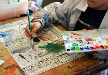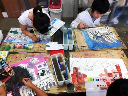 5年生、「いつも見ている風景を…」の授業。前回まで、濃さの異なる鉛筆、消しゴム、指、自作のペンとインクを使って、その場に対する自分の思いを大切に描いてきました。今週からは、それらの線や形、痕跡を手掛かりに絵の具で描いていきます。(図工専科)