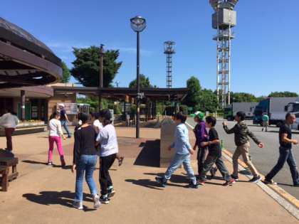三芳パーキングエリアでトイレ休憩です。バスの中では、バスレクをしながら楽しく過ごしてます。