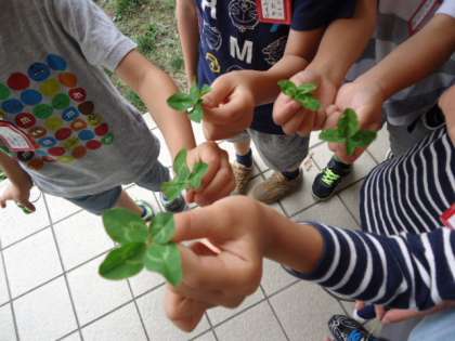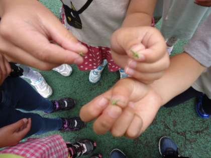 「見つけた!」と言って見せてくれたのは4つ葉のクローバーとショウリョウバッタでした。「初めてバッタを見つけたよ。」と話している子もいました。(副校長)