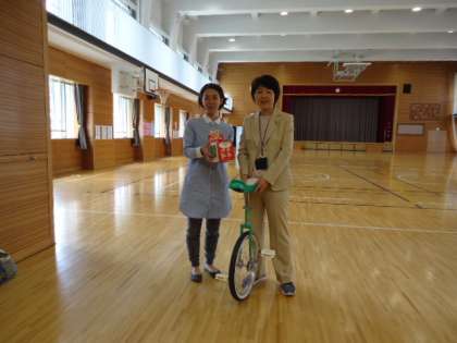 今日、全校朝会で一輪車がPTAから寄贈されました。