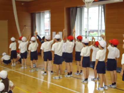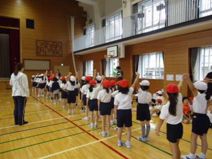今日は気温が低くてプールには入れなかったのですが、体育館でプール開きを行いました。