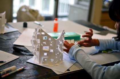 6月23日の授業より。2週間ぶりの3年生の授業。カッターナイフで「家」をつくりました。白い画用紙を自由に切り抜き、玄関や窓、階段やベランダをつくってみたり…。道具を自由に使える喜びを覚えると、子どもたちの表情は変わります。しばらくして教室を見渡すと、なんだか建築事務所いるような気分になってきました。(図工専科)