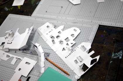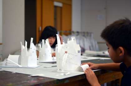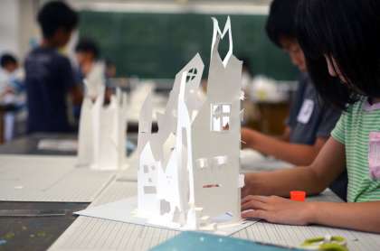 今週の3年生。子どもたちの強い希望で、カッターナイフでの家づくりをもう1時間、延長しました。当初は、窓やドア、ベランダ、階段くらいつくれたらいいなと考えていましたが、子どもたちの創造力は無限です。テーブル、イス、噴水、すべり台、ポスト、ブランコ、塀、樹木、テント、信号、人間、動物、車など、カッターナイフ1本で、夢のある家、ものがたりのある家、暮らしの見える家がたくさんできあがりました。最後に題をつけて、お互いの作品を鑑賞しました。(図工専科)