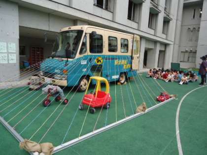 子どもたちは、配達車の運転席に座り車の死角を実感しました。