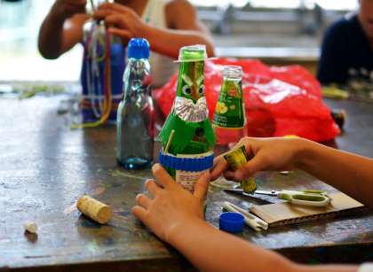 材料コーナーには、どこにでもありそうなもの、普段はつい捨ててしまうようなものを用意しておきました。例えば、余った画用紙や異なる質感の紙片、新聞紙、包装紙、スポンジ、ダンボール片、毛糸やリボン、ボタン、キャップ、ゼリーカップ、ストローなど。「え、こんなものでも材料になるんだ!?」、そんなことにも気づいてほしいなぁと思いながら…。