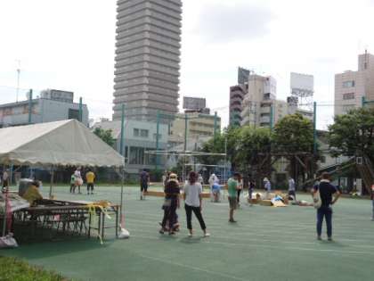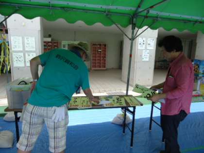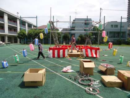 今朝、8時から地域の方やPTAの皆さんが集まって、盆踊り大会の準備をしています。(副校長)