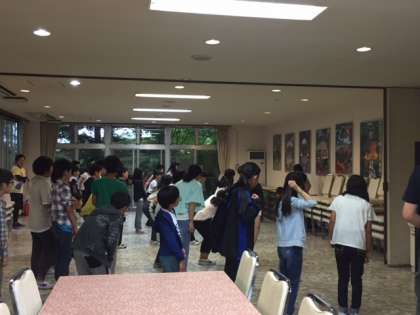 眠そうですが、みんな元気に、時間通りに集合しました。小雨が降っていたので、ホールで朝会をしました。