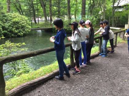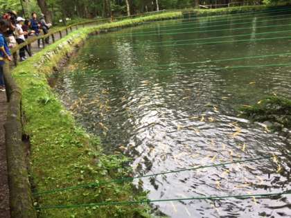 ニジマスやレイクトラウト、イトウなどの魚に餌をあげています。