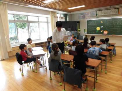 1年生の教室では、出席をとる時に、「久しぶり」と言って、担任の先生と握手をしていました。