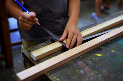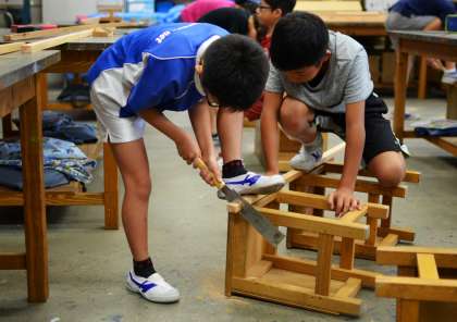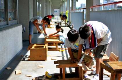 今週の4年生、「トケイランド」の授業。この題材では両刃のこぎりを使った工作に挑戦します。縦びきと横びきの違い、箱イスを使った角材の固定の仕方、のこぎりの正しい持ち方、ひくときの姿勢など基本的な動作のポイントを確認しながら、安全で正しいのこぎりの使い方を身につけていきます。確実に使えるようになるためには、とにかく基本の動作を繰り返すことです。この授業のために材木店から杉の小割、抜き板をたくさん取り寄せました。授業を通してのこぎりを自由に使いこなせるようになってほしいなと思います。さしがね、クランプの使い方も併せて学習しました。(図工専科)