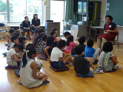 絵本のないお話では、子どもたちはお話に集中し、場面を想像していました。(副校長)