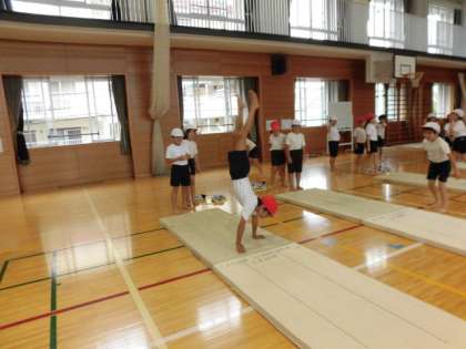 「みんなでマットマスターになろう」という単元名通り、「みんなで」の実現のために、上手な友達をよく見たり、課題について伝えあったりしていました。