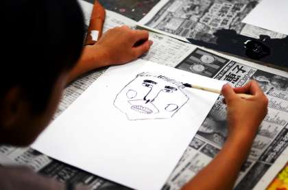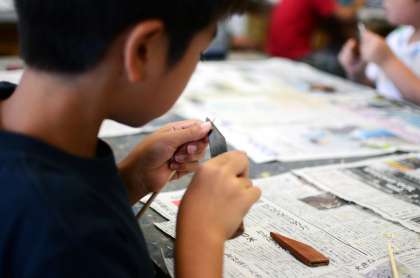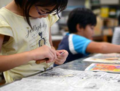 3年生が最近取り組んだ題材は、「木の枝でマイペンをつくろう」。切り出し小刀の使い方を身につけ、枝の先を削り、描くための道具をつくりました。まず小刀のしくみ、さやの抜き方、小刀の持ち方など基本的なことを学習したあと、割りばしを使って削る練習をしました。授業の冒頭、子どもたちの前で割りばしを削って見せると「鉛筆削りで削ったみたい!」という声があがりました。「先生が小学生のときは、全員小刀を買って、自分で鉛筆を削っていたんだよ」と言うと、「えー、こわ〜い」という声が返ってきました。確かに刃物と言えば、新聞やニュースで間違った使い方によって起きた事件等がたびたび報道されていますから、子どもたちにとって恐ろしいものという印象が強いのかもしれません。一方、「早く使いたい!」と興奮気味の子どももいます。小刀は料理をするために欠かせない包丁と同じく、長い歴史の中で人間がつくり出した生活を豊かにするための尊い道具であることは間違いありません。この授業を機会に、道具の正しい使い方、道具との向き合い方、そのようなことを実感として掴んでほしいなと思っています。