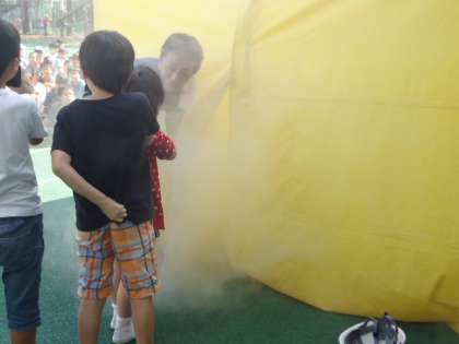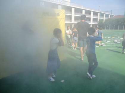 私も煙の中を歩きましたが、真っ白でかろうじて足元が見える程度でした。(副校長)