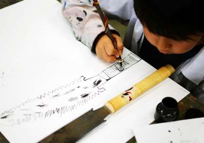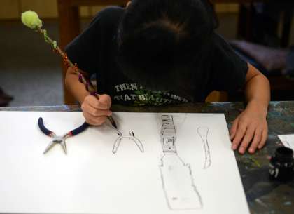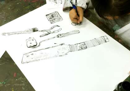 3年生、「図工室の道具図鑑」の授業。前時の「木の枝でマイペンをつくろう」では、小刀を使って枝の先を描きやすい形に削り、飾りつけをし、特別なペンをつくりました(「10月11日 図工室より」参照)。この授業では、そのペンを使って図工室の道具を描いていきます。これから6年生までに使うであろう道具をすこしでもたくさん覚えてほしいなと思っています。(図工専科)