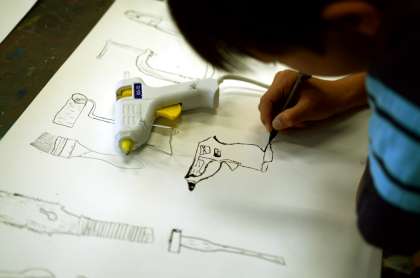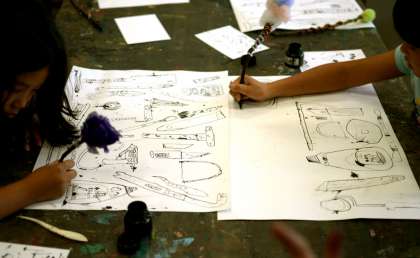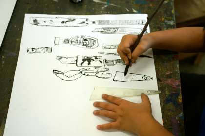 3年生、「図工室の道具図鑑」の授業。この授業で子どもたちに繰り返し話していることは、“よく見て描くこと”と“道具の使い方を想像しながら描くこと”です。図工室にある道具を手元に置き、自作したペンにインクをつけ、下描きをしないで直接、画用紙に描いていきます。下描きしないで直接描くのには理由があります。道具の隅々までしっかり見てほしい、緊張感をもって真剣に取り組んでほしいからです。また、この段階では、道具の名前を聞かれてもあえて答えません。道具の名前よりも、使い方を想像したり、形の不思議さやおもしろさに意識を向けたりしてほしいからです。(図工専科)