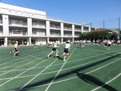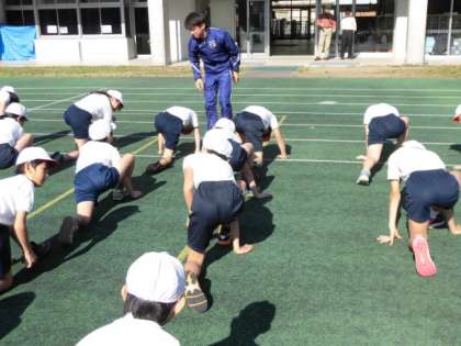 駒澤大学陸上部の藤田コーチと加藤コーチがいらして、5,6年生に走り方の指導をしてくださいました。