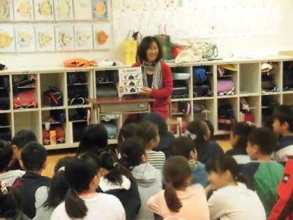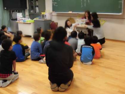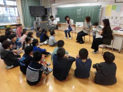 各クラスで読み聞かせをしていただき、子どもたちは興味をもちながら聞いたり、さし絵をのぞきこんだりしていました。