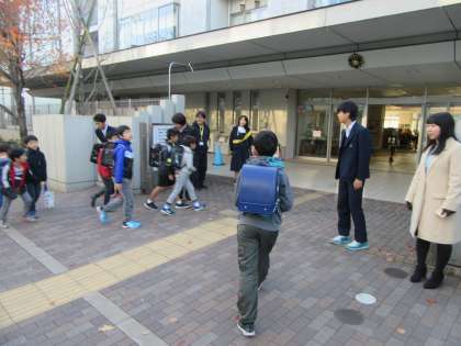 駒沢中学校の生徒が駒沢小学校まで来て、あいさつ運動をしてくれました。寒くなり、顔が下を向きがちな時期ですが、元気のよいあいさつによって、気持ちの良い朝を過ごすことができたように思います。あいさつ運動の後、駒沢小学校の運営委員会の児童が小学校の代表として、お礼を言いました。 (特別活動担当)