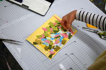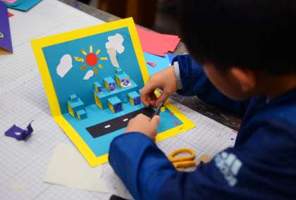 今週は、台紙に貼ったり表紙をつくったり、最後の仕上げです。色画用紙や折り紙をはさみやカッターナイフで切り抜いたり、貼り合わせたりして絵や文字をつくるのは、時間もかかりますし、子どもたちにはとても面倒な作業かもしれません。しかし、その費やした時間、試行錯誤の過程は、“伝えたい思い”となって作品になっていきます。また、その“思い”があればカッターナイフなどの技術も自然と上達していくはずです。