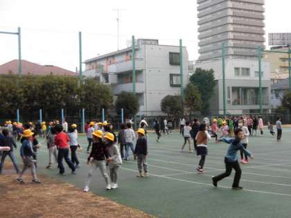 休み時間には、曇り空にもかかわらずたくさんの子供たちが外に出て遊んでいました。