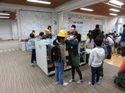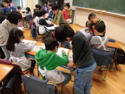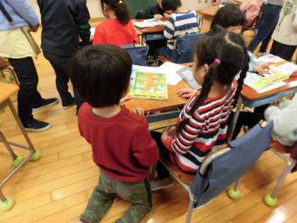 1年生は、園児に、ランドセルを背負わせてあげたり、普段勉強している教科書を見せて説明したり、親切に教えていました。とても微笑ましい光景でした。