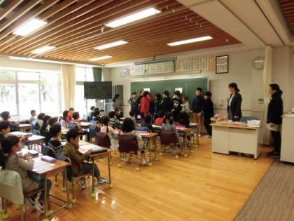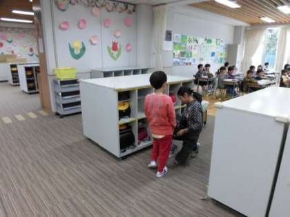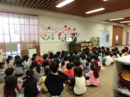朝の準備が終わると、オープンスペースで、図書館司書の方が読みきかせをしてくださっています。お話を聞く姿勢も立派です。