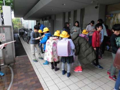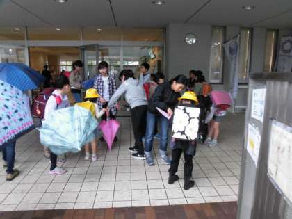 6年生が「端っこによって傘をたたんでください。丸めるのがうまくいかない人は手伝います。」と誘導し、1年生の手伝いをしてくれました。