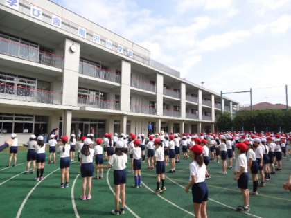 今朝は全校で体育朝会を行い、ラジオ体操の練習をしました。